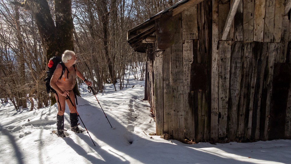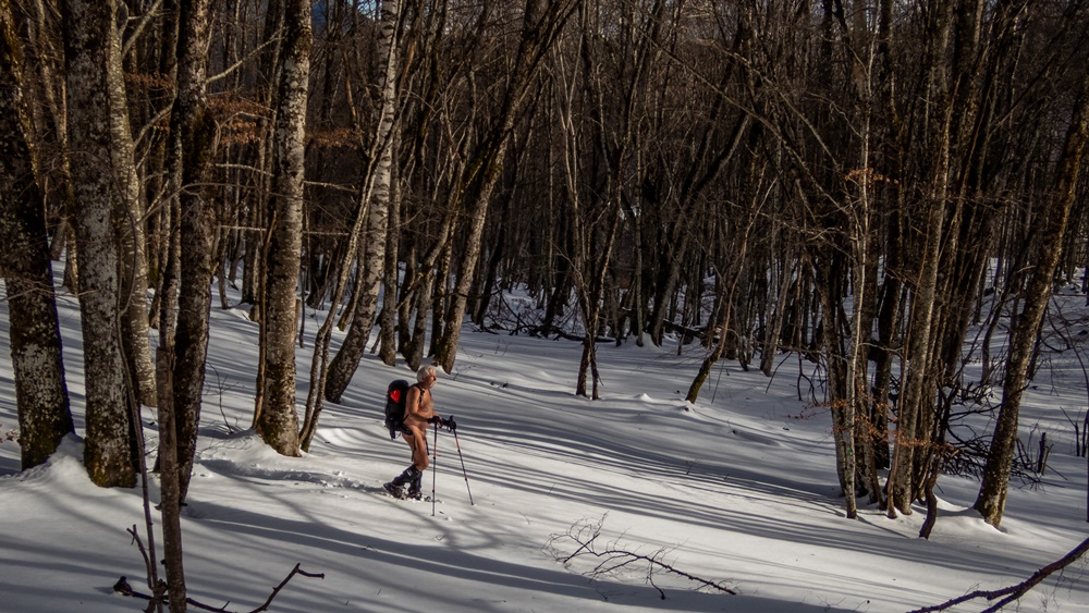 Mid-January. After a few days of freezing cold, the temperature has risen by at least 10°C. The sun is shining too. I already went hiking the day before in the Vercors, but I decide to go for a walk that I know well above the hamlet of Le Gua. I set off fully dressed: overtrousers, technical jersey, fleece, and jacket. It’s about 7°C. A fifteen-minute stretch of almost flat ground to warm up. I arrive at the crossroads at the bottom of the climb. There, I take off my jersey and fleece, keeping only my jacket on, and I also take off my overtrousers and put on some quick-dry shorts. I did the right thing, as a man with his dog comes running towards me. “It’s almost spring! – Yes, it’s warm.” I’m afraid he’ll go in the same direction as me, but no, he heads away towards the hamlet. I tackle the long and thankless climb on this old, stony forest track. But very quickly I reach the first patches of snow and realize that there are no tracks. So I can take everything off. It’s so much more pleasant. Halfway up the slope, I decide to put on my snowshoes. After an hour and a half of uninterrupted climbing, I reach the break in the plateau and the old hut that is starting to fall into ruin. From there, I turn right through the forest and climb up to the ridge. I usually continue to the right towards the Oeillon, a rocky monolith that is a popular hiking destination. But on this ridge, I come across a recent trail, perhaps from the day before. I decide to follow it, turning left to see where it might lead. It winds between the trees at the edge of the cliff and finally descends steeply via steps carved into the snow on the north-facing slope in the shade above the village of Mont Saint Martin. I don’t venture to follow it, but check the map. There is indeed a route on that side. I didn’t know about it, but it would certainly be worth exploring… but later, in summer. After a picnic break, I return to the cabin, cutting through the forest at random. It’s fairly easy to find your way on this plateau bordered by cliffs. Then comes the descent, which is almost as long as the climb. I remain naked until I am about twenty meters from the road where my car is parked. Four hours of nudity at this time of year, I’m not going to complain!