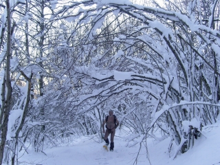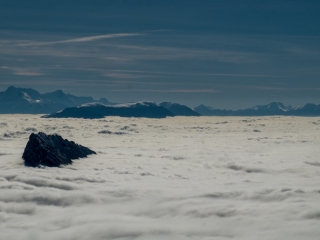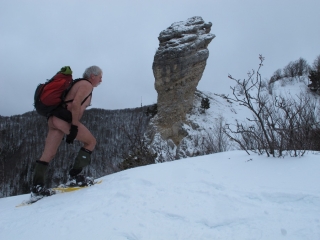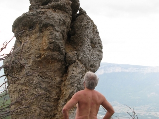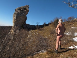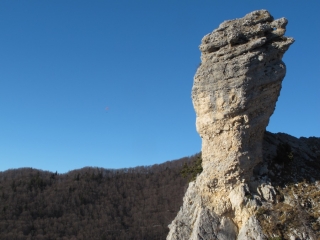 Depuis des années, j’ai pris l’habitude de monter jusqu’à l’Oeillon au mois de janvier, histoire de bien débuter l’année. En quelque sorte un pèlerinage hivernal qui se déroule soit en raquettes dans la poudreuse, soit les pieds au sec sur l’herbe quand la neige se fait désirer. L’endroit se prête bien à la randonnue. Il faut dire que le coin n’est pas trop fréquenté. La première partie jusqu’au Petit Sappey assez ingrate décourage sans doute pas mal de monde. Une fois atteint le plateau, l’ambiance est tout autre. A la cabane du Petit Sappey, prendre le chemin de droite qui se faufile en sous-bois de façon bien plus agréable. Plus loin, il ne faut pas manquer l’embranchement à gauche signalé par un cairn. Le sentier, parfois à peine marqué, monte souvent droit dans la pente, se faufile entre les arbres jusqu’à une petite prairie en clairière. Tout en haut, on débouche sur ce monolithe de pierre, rocher isolé qui se dresse comme une sentinelle en avant-garde des Rochers de Chalves. Une sente permet de contourner la pente et de rejoindre son pied, quand il n’y a pas de neige, ni de terrain trop glissant après la pluie. On peut revenir par le même chemin ou redescendre en restant sur la ligne de crête et en coupant ensuite à travers bois pour retrouver la cabane. Aux alentours, en s’approchant des falaises, on surplombe une série de pointes effilées et de clochetons qui dominent les hameaux de Pomarey et Planfay.