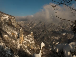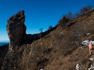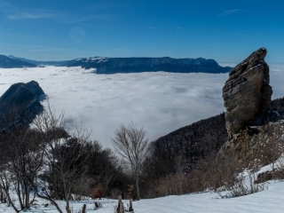 For years, I have been in the habit of going up to the Oeillon in January to start the year off right. It’s a kind of winter pilgrimage that takes place either on snowshoes in the powder snow or with my feet dry on the grass when the snow is desired. The place is well suited to hiking. It is not too crowded. The first part up to Petit Sappey, which is quite ungrateful, probably discourages a lot of people. Once you reach the plateau, the atmosphere is quite different. At the Petit Sappey hut, take the path on the right which winds its way through the undergrowth in a much more pleasant way. Further on, don’t miss the junction on the left, marked by a cairn. The path, sometimes barely marked, often climbs straight up the slope, slipping between the trees to a small clearing meadow. At the very top, you come to this stone monolith, an isolated rock that stands like a sentinel in the vanguard of the Rochers de Chalves. A path allows you to go around the slope and to reach its foot, when there is no snow, nor too slippery ground after the rain. One can return by the same path or go back down, staying on the ridge line and then cutting through the woods to find the hut. In the surrounding area, as you approach the cliffs, you can see a series of tapering peaks and bell towers overlooking the hamlets of Pomarey and Planfay.